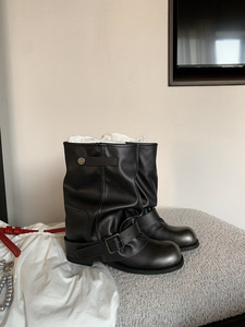 葡萄妈同款现货~ 辣妹裤管靴~ 时髦废土风褶皱扣带西部短靴女秋季