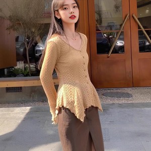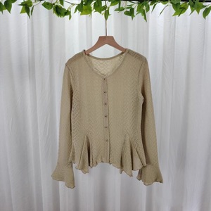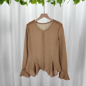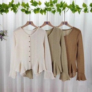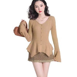 法式镂空掐腰喇叭袖上衣女早秋新款针织衫气质百搭卡其色显瘦小衫