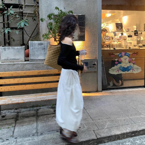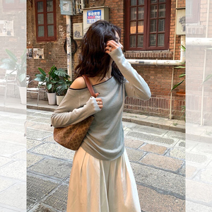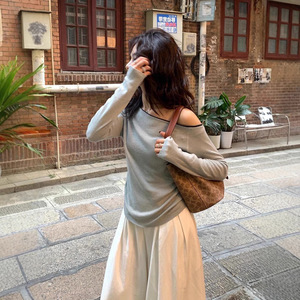 韩里韩气巨好看设计感上衣高级感灰色斜肩一字领露肩针织衫女春秋
