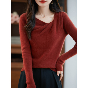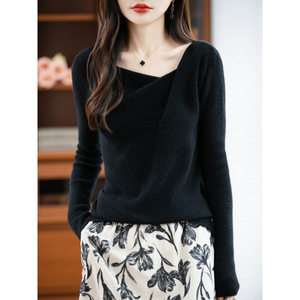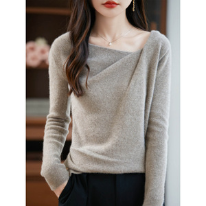 25秋冬新款纯羊毛高端设计荡领针织衫长袖女纯色洋气羊毛打底衫女