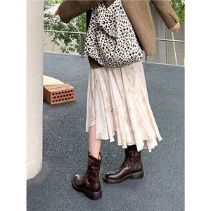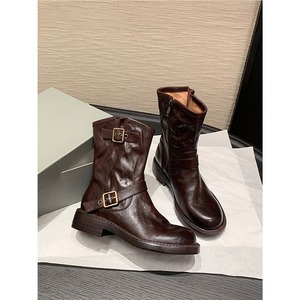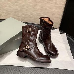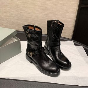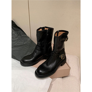 香港复古真皮西部时装靴女2025春秋新款时尚百搭皮带扣粗跟马丁靴
