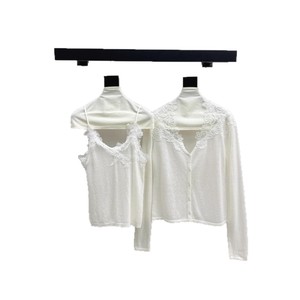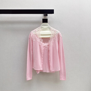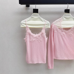 深圳南油新款羊毛上衣两件套名媛纯欲V领小吊带+肩部拼接蕾丝开衫