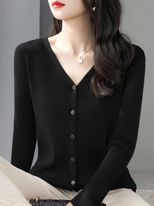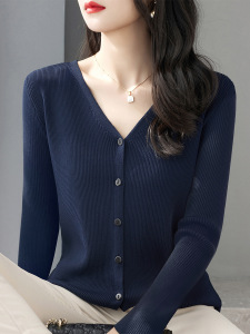 藏青色长袖针织开衫外套2025秋季新款修身气质V领上衣纯色毛衣女