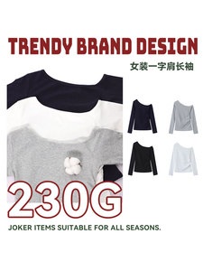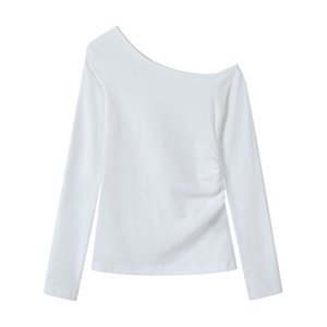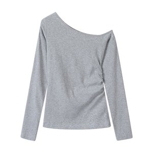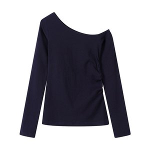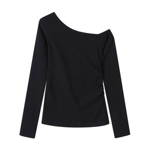 秋冬新款女装斜肩侧面抽褶修身长袖T恤纯色辣妹露肩打底上衣女t