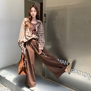 实拍韩系松弛感格子衬衫套装2025秋新款气质减龄背心阔腿裤三件套