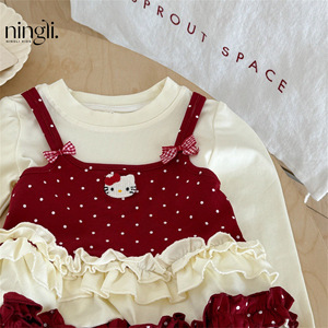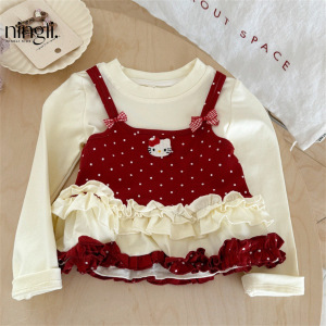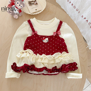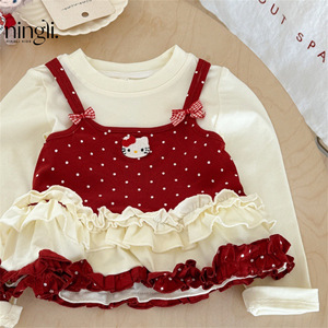 【柠里】童装女童红色假两件T恤秋季新款儿童女宝宝波点花边上衣