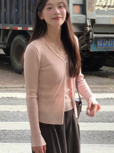 粉色V领针织开衫吊带两件套女早秋韩系穿搭漂亮修身短款毛衣外套