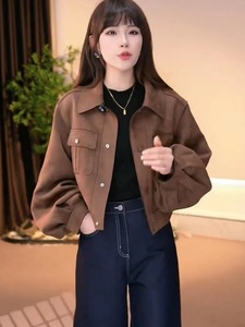 短款翻领麂皮绒外套女2025秋装新款小个子时尚百搭休闲夹克上衣潮