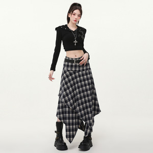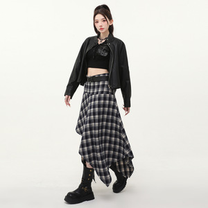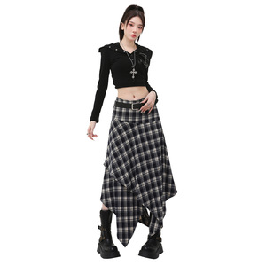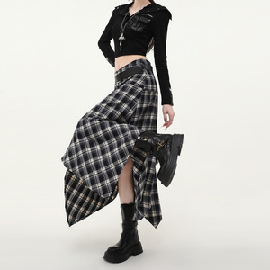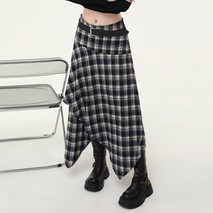 复古毛呢半身裙女中长款2025秋冬新品高腰显瘦不规则格子裙送皮带