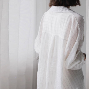 Warm02025春秋夏季宽松防晒衣条纹棉麻长袖衬衫女中长款外穿上衣