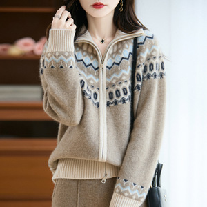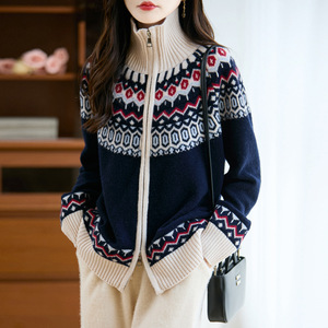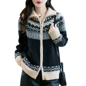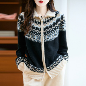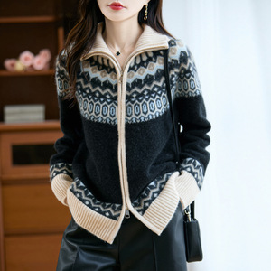 费尔岛提花山羊毛开衫女厚款针织毛衣外套减龄2025秋冬女装上衣新