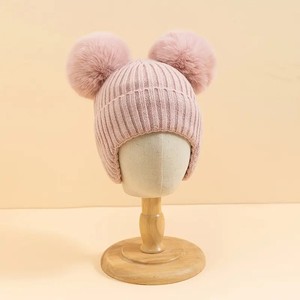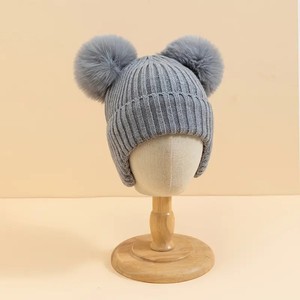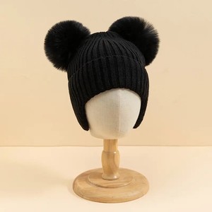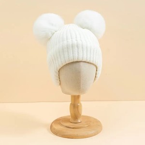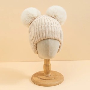 欧美秋冬新款针织帽仿狐狸大毛球毛线帽纯色时尚条纹百搭亲子帽子