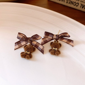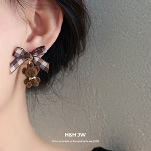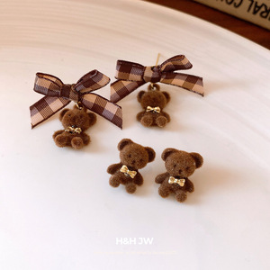 银针植绒小熊蝴蝶结耳环2025新款百搭耳钉甜美可爱耳饰设计感小众