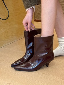 高级感!黑色尖头软皮低跟短靴女秋冬新款宽筒靴子