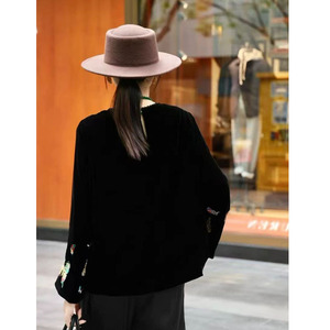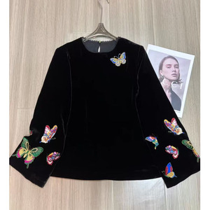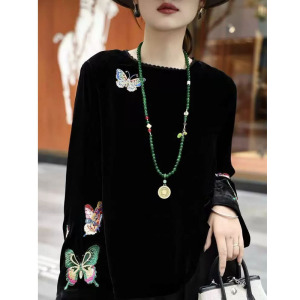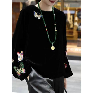 2025秋季新中式国风轻奢圆领丝绒蝴蝶刺绣衬衫女唐装内搭小衫上衣