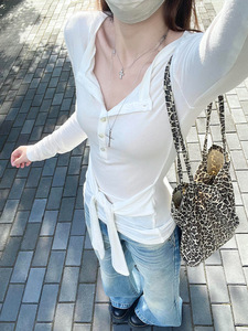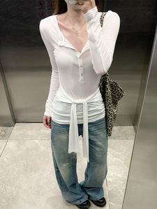 韩系辣妹绑带V领长袖t恤女早秋季2025新款修身简约百搭纽扣上衣潮