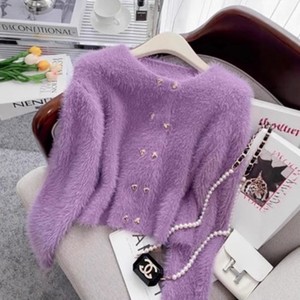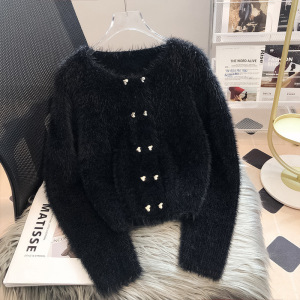 韩系圆领仿水貂绒双排扣软糯毛衣女秋冬新款甜美温柔短款针织开衫