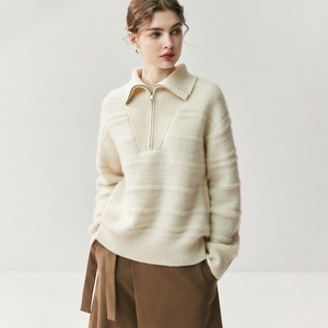 2025秋冬新款气质山羊绒衫女翻领半拉链银丝落肩横麻花针织毛衣