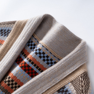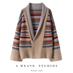 女式山羊绒衫针织外套V字领加厚开衫重工提花复古民族风长袖毛衣