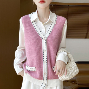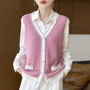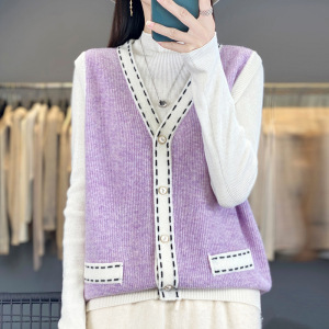 100%纯羊毛2025秋冬新款女式宽松v领气质小香风针织开衫背心马甲