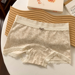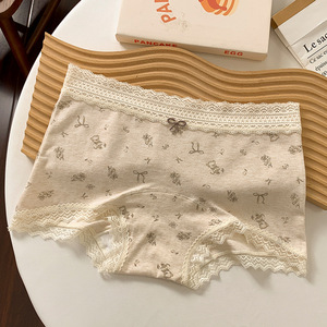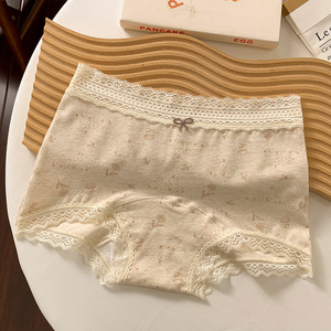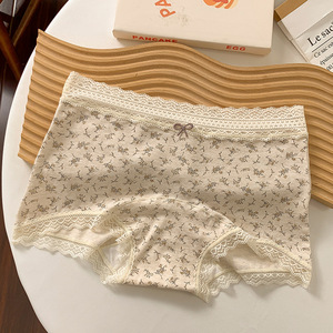 女士平角内裤10A全棉抗菌加长裆碎花蕾丝边舒适透气女生中腰内裤
