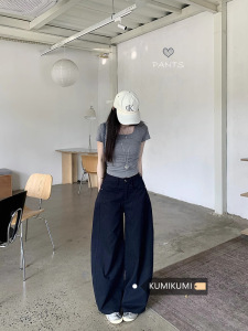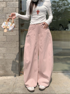 美式慵懒风弯刀裤粉色休闲裤女秋季高腰宽松阔腿裤百搭小个子长裤
