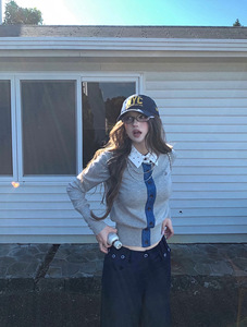 新款西太后复古假两件针织土星刺绣POLO领拼接设计层次感慵懒上衣