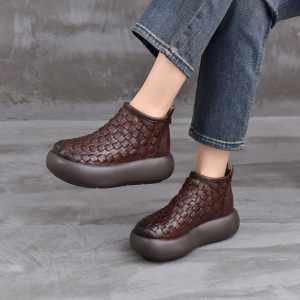 2025新款复古休闲手工编织松糕厚底真皮短靴女头层牛皮单靴棉靴