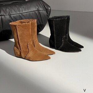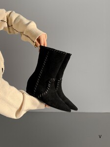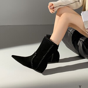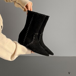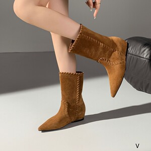 欧洲站女鞋25秋冬时尚软高丝光牛反绒皮尖头舒适款套筒内增高短靴