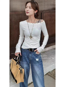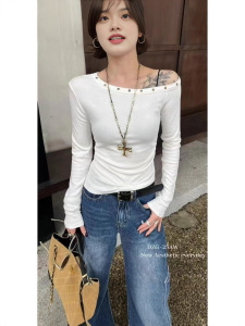 辣妹铆钉斜领露肩长袖t恤女2025早秋新款褶皱收腰打底衫上衣外穿