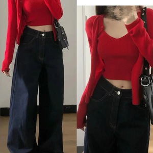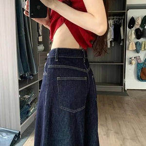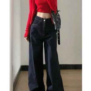 辣妹复古阔腿高腰牛仔裤女秋冬美式设计感深蓝色直筒宽松拖地长裤