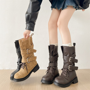 2025新款圆头粗跟中筒靴配裙子小众设计感皮带扣百搭时尚骑士靴女