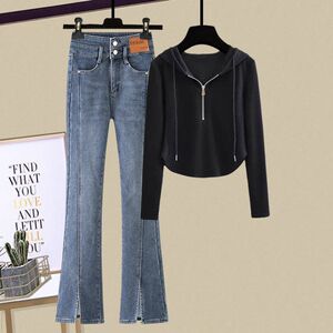 小个子套装女春季新款纯欲辣妹风修身长袖卫衣搭配开叉微喇牛仔裤