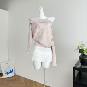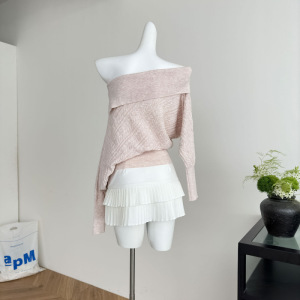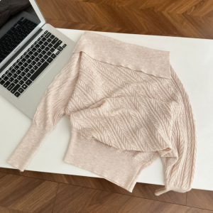 羊毛翻领长袖绞花毛衣女粉色不规则针织上衣