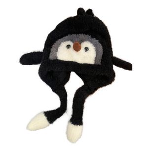 日系可爱小企鹅毛绒帽女秋冬加厚保暖护耳百搭显脸小针织套头帽子