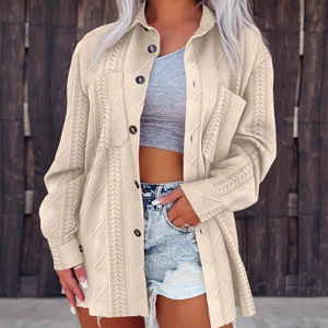2025独立站亚马逊新款 秋冬简约时尚翻领纯色纽扣花纹针织外套女