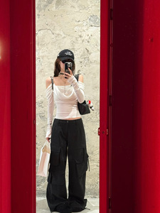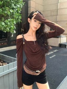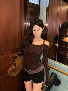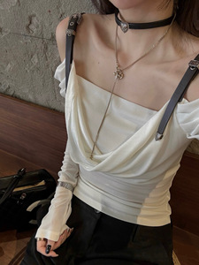 批发欧美复古设计感白色皮肩带一字肩长袖T恤女秋季别致显瘦上衣