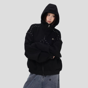 秋冬新款国潮情侣美式「拼接铆钉拉链卫衣」男女宽松连帽开衫外套