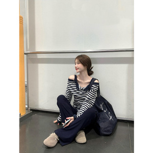 韩系穿搭甜辣风假两件条纹一字肩长袖t恤女早秋季设计感露肩上衣