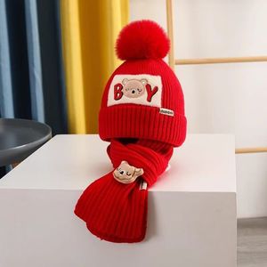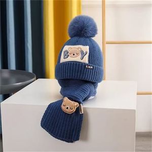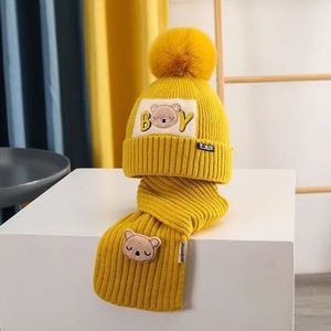 2025冬季新款儿童套帽小熊毛线针织帽加棉保暖宝宝帽子围巾两件套