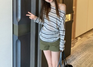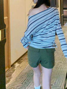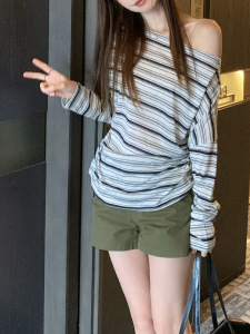 条纹长袖t恤女早秋季宽松慵懒风收腰一字肩上衣外穿