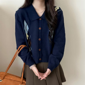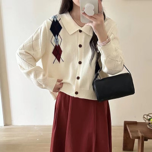高级感菱格领毛衣外套女宽松秋装新款韩系慵懒针织衫开衫