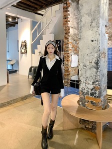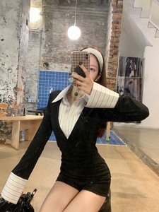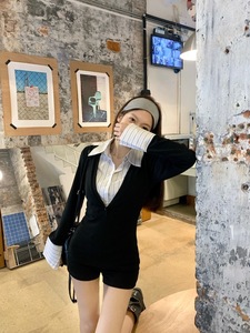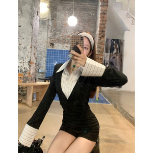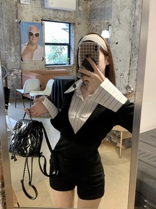 韩版设计感条纹假两件拼接T恤女春秋季修身款显瘦长袖打底衫上衣