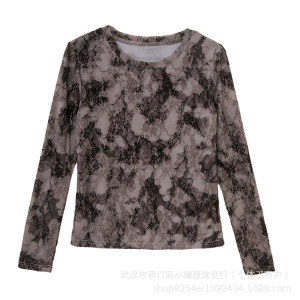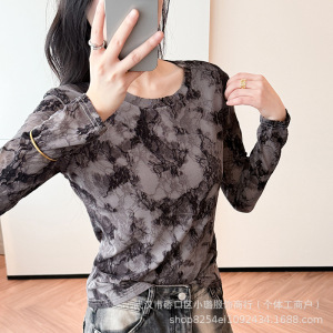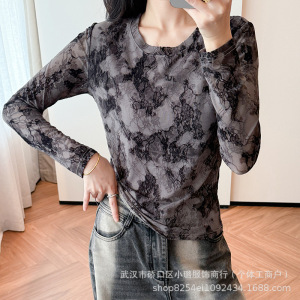 秋季圆领重工雕花长袖网纱打底衫修身女士百搭打底衫时尚洋气上衣