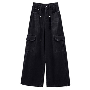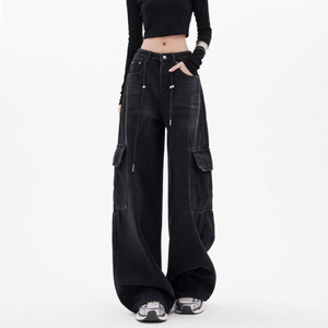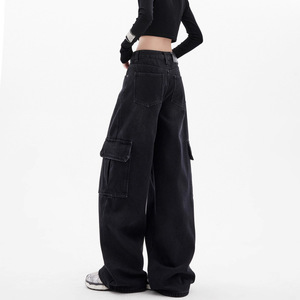 美式黑色阔腿工装牛仔裤女2025年秋季新款高腰设计感宽松直筒裤子