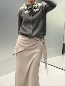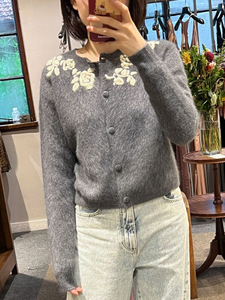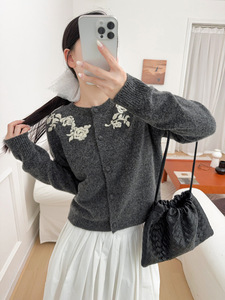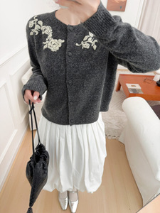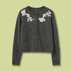 灰色圆领针织开衫复古刺绣25秋冬新款潮流高级绣花长袖羊毛开衫女