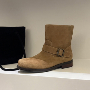 牛皮版~新款韩版圆头皮带扣短靴女真皮低跟短筒踝靴平底中筒靴子