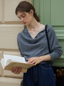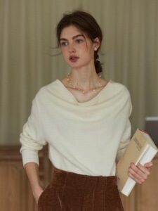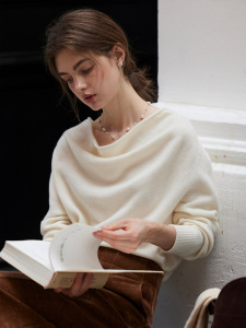 港米服饰/2025秋冬款100%羊毛法式优雅荡领一字肩毛衣内搭针织衫