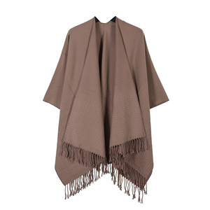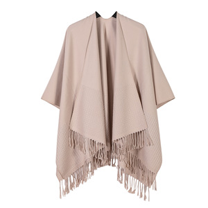 新款简约百搭纯色流苏开叉披肩外搭女士立体波浪提花保暖开衫斗篷