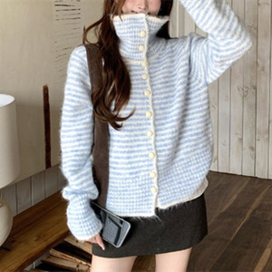 秋冬新款温柔简约风软糯条纹针织上衣女韩系翻领条纹长袖毛衣外套